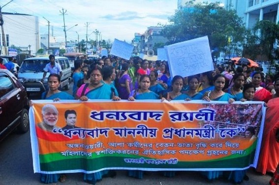 A massive rally was conducted by Asha and Anganwadi employees at Agartala today greeting the BJP led Central Govt.