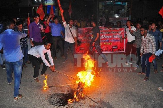 AGARTALA, Sep 25 (TIWN): As BJP, RSS call for 'Bangla Bandh' on Sep 26 ABVP activists in Tripura have burnt Mamata Banerjee's effigy on the murders of Rajesh and Tapas at Bengal.