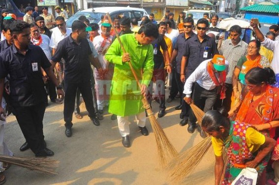 AGARTALA, Sep 30 (TIWN): Narendra Modi’s Swatch Bharat (Clean India) campaign turned a comedy show by BJP Politicians as Ministers, MLAs choosing to sweep ‘clean roads’ rather than targeting dirty corners of cities. On Sunday morning at Bodhjung Chowmuhani, Agartala, clean shaved, bathed, crispy dressed Chief Minister Biplab Deb targeted a clean road to sweep alongwith BJP workers. Surprisingly, Politicians are avoiding Agartala’s dirtiest parts like Gol Bazar ( Maharajganj Bazar), Batttala Bazar, various markets. Due to CPI-M era’s wrong decisions of cement covering drains which stopped cleaning drainage systems are now resulting overflooding streets after a splash of rain.
