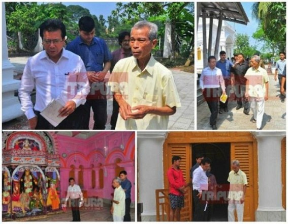 AGARTALA, Oct 15 (TIWN): BJP's ally IPFT is now in action of damage control after BJP Govt ordered a saffron coat across ancient Durga Bari temple ahead of Durga Puja. Today IPFT President cum Forest Minister NC Debbarma had visited Durga Bari temple, 1 day after the temple was re-coloured with white recovering it from saffron colour. NC Debbarma's visit even though raised question whether he came from IPFT party or BJP-IPFT Govt, but NC Debbarma declined to answer anything supporting or protesting over the saffron colour. NC Debbarma also talked to the priests and officials regarding the needful renovations for Durga Bari temple. Addressing media, NC Debbarma said, "Tripura is now in festive mood. The weather is also now in our favour. For few days, due to Titli the weather was in bad shape but now Titli is also gone and weather is in our favour. We'r hopeful that puja will go nicely and the preparations in this regard is already completed. Public are rushing the pandals which proves that the state is in festive mood. The coming days also will go well, we are hoping that. I am now visiting this temple (Durga Bari) where the final touch is being given before Durga Puja. From State Govt side, I greet whole Tripura. Wishing everyone to stay well in Durga Puja". The issue was raised which has compelled NC Debbarma to visit in the Durga Bari was when under BJP-IPFT Govt, allegedly with direction of Chief Minister Biplab Deb's Bangladeshi cousin brother Subhash Deb saffron colour was coated on Durga temple on October 14.