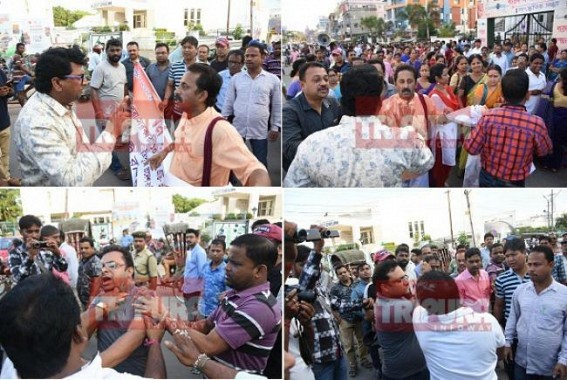 10323 Teachers split into BJP and CPI-M groups started a street brawl as Police had a tough time to control unruly 10323 teachers.