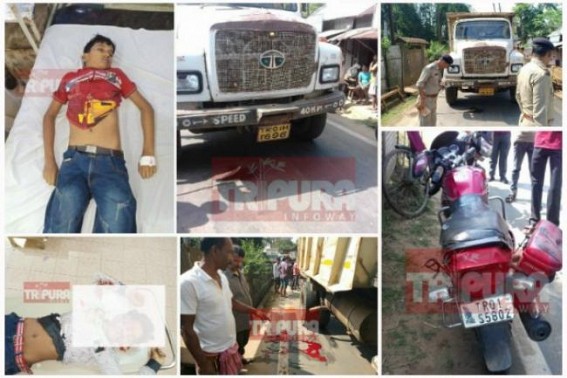 AGARTALA, Nov 9 (TIWN): In a shocking development, one 12 years boy and another 17 years boy died near Hapania hospital / TMC on Friday after their bike hit with a truck. Total three youths were riding the bike without helmets and they lost control in driving when the big sized truck came in speed before them. When the driver of the bike tried to brake the bike, it lost control and taking three of the riders, the bike went inside the truck. Locals immediately brought the injured three teenagers in Hapania hospital, but doctors declared two of them as dead. One more is critical, admitted in the same hospital, whereas at the primary investigation police spotted the reckless driving was solely responsible for the accident. TIWN team also rushed to the spot and it has been seen that the truck is left in the middle of the road which means it was also in reckless mode, didn't give space to the biker to go on that narrow road in high speed.The two deceased are : 1) Rakesh Singh (17) S/O-Chandan Singh, 2) Asish Hazari, S/O-Nepal Hazari.Police team is visiting the spot and interrogating the locals of Hapania. The truck bearing number TR01 M 1696 has been seized.