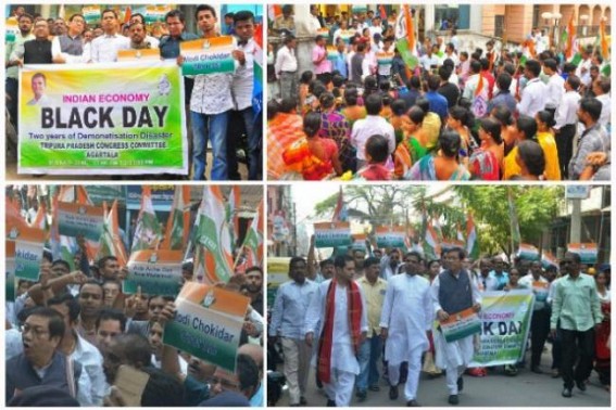 AGARTALA, Nov 9 (TIWN): On the 2nd anniversary of Modi's demonetization, along with the national level protest of Congress, Tripura Congress activists led by Congress President Birjit Sinha and top leaders as Pradyot Kishore Deb Barman, Gopal Roy have also observed "Black Day" to mark the anniversary of Demonetization blaming demonetization has ruined Indian Economy. Addressing media, State Congress President Birjit Sinha said, "Prime Minister Narendra Modi's demonetization killed 120 people in bank rows, economy has downed. This demonetization was held to make the black money of BJP leaders into white. Amit Shah is an example who turned his 700 crores of black money into white and the common men suffered. Thus, in protest of Demonetization under Congress National President Rahul Gandhi we have launched the protest. To common men we want to tell that behind the pathetic economic condition only and only PM Modi is responsible". The Congress leader further said, "Each institution under Modi Govt has been tried to be politicized including Supreme Court, CBI RBI". Congress also raised slogan, 'Modi Chokidar Chor Hai'