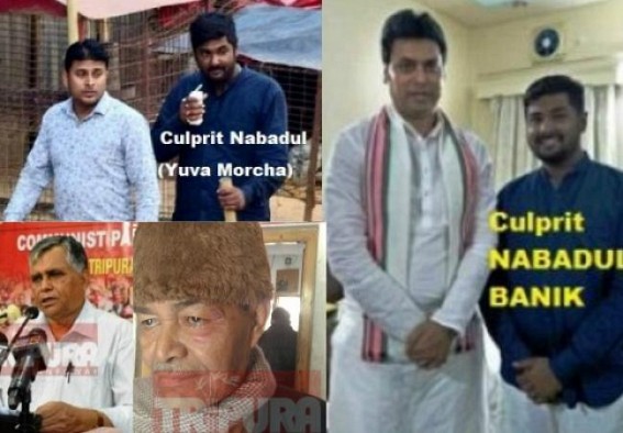 AGARTALA, Dec 29 (TIWN): If not BJP, who did slap Ex-Minister Bhanulal Saha ? If police plays neutral role, why no arrest of Nabadul Banik led goon for attacking Bhanulal Saha and on the next day CPI-M General Secretary Gautam Das ? Why there was no action against Nabadul Banik after with footages it was shown how he attacked CPI-M’s meeting and Ex-CM Manik Sarkar’s convoy. After so many attacks, injuring 75 years old woman, BJP has claimed the election was peaceful. So far no action was taken against BJP’s “marked†criminal of Bishalgrah Nabadul Banik even after he and his team had slapped, punched Ex-Finance Minister Bhanulal Saha and his tea,m further attacked Gautam Das at Bishalgarh. BJP Yuva Morcha Bishalgrah President Nabadul Banik who before a month back had attacked former Chief Minister Manik Sarkar at Bishalgrah today has slapped, punched 65 years old, Ex-Finance Minister of Tripura Banulal Saha on his face when he visited polling centres during Municipal by-poll.Saha’s spectacle was also broken in that attack and he received injuries on his face. Even though FIR was lodged but police have not taken any action yet.