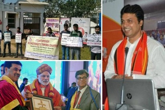 AGARTALA, Jan 7 (TIWN): Embarrassed Indian scientists and research scholars gathered at the Tripura University to protest against the irrational statements made by some speakers at the Indian Science Congress underway in Punjab. The protest was staged at Tripura University by “Breakthrough Science Society Tripura chapter†after Andhra University Vice Chancellor G. Nageshwar Rao claimed that Kauravas (epic characters of Mahabharata) were test tube babies whereas Srilanka had Airports (referring another epic Ramayana). . At the same session, KJ Krishnan, a scientist at a centre in Tamil Nadu , said that Isaac Newton and Albert Einstein were both wrong and that gravitational waves would soon be rechristened “Narendra Modi wavesâ€. However such claims are not wrong when you are man of Narendra Modi as recently in Science Fair, Chief Minister Bipab Deb raised question to all of them who criticized his internet-was-existing-in Mahabharata’s time, “Who are you to decide what is science and what is notâ€.