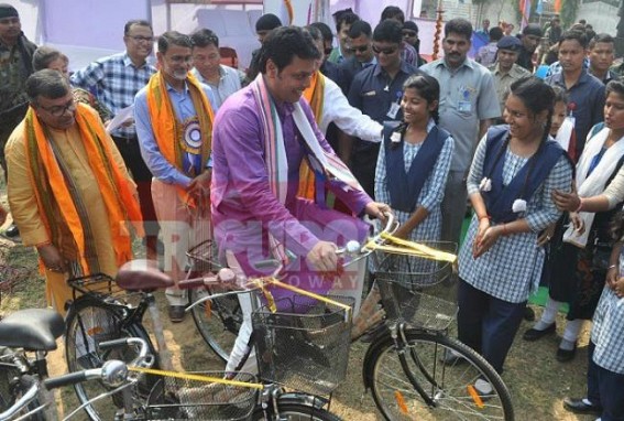 AGARTALA, Feb 23 (TIWN): Like every year, this year also bi-cycles were distributed to girl students of Class-9 by State Education Department, but criticism erupted after BJP claimed that for the first time such event took place and CM Biplab Deb claimed that this initiative comes under Beti-Bachao-Beti-Padhao scheme. This project was started by the then Manik Sarkar’s Govt back in 2012, but Chief Minister Deb today himself inviting media not only led an election campaigning with girl students of MTB school but also further claimed that it is Modi Govt’s Beti-Bachao-Beti-Padhao scheme benefiting 30000 girl students of class-9 in Tripura. Along with Biplab Deb, Education Minister Ratanlal Nath was also present. CPI-M in its social media has slammed the BJP for claiming the project as BJP’s first ever project for girl-students. According to last 11 month’s Govt in Tripura, BJP Govt is unable to proceed CPI-M Govt’s projects properly, due to fund crisis as Modi didn’t give anything to Tripura yet.