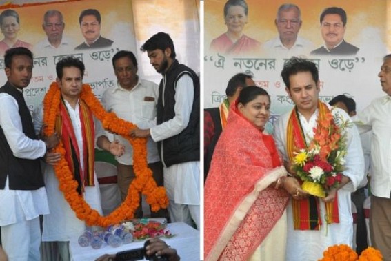 AGARTALA, Feb 2 (TIWN): Tripura Congress’s new State President Pradyot Manikya at his felicitation programme has briefed about few changes he wants to do inside party as a State President.Among those changes, he talked about elevate women party members with their deserved posts which other parties do not do.Also Pradyot Manikya mentioned, the party must lead by young educated people and those who are not corrupt and involved in any illegal activity. Manikya welcomed people to join Congress and work with him. His stand for his Tiprasa community said, will remain unchanged. Congress chief Rahul Gandhi on February 25 appointed Tripura royal scion Pradyot Bikram Manikya Debbarman as the state party President and today State Congress welcomed Pradyot Manikya under massive celebration. Huge numbers of Congress supporters gathered at Congress Bhawan to greet Maharaja Pradyot Manikya as Congress President. Various religions’ people also participated in the welcoming ceremony and a rally was organized in this regard.