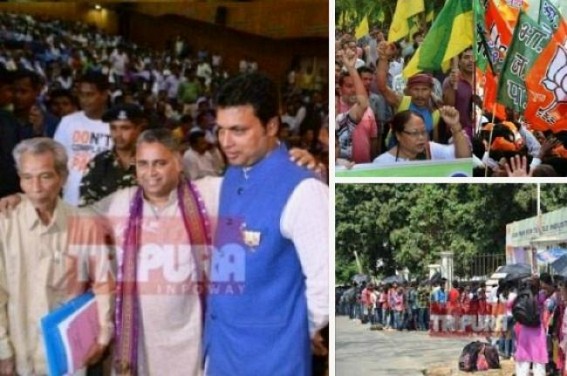 BJP’s Vision Document unfurled by Arun Jaitley, it says in page 6 Point No-7, “There are about 50,000 vacancies in the state government. We will fill up all these vacancies within a year through a transparent process”. Earlier even though in CPI-M Govt’s time, BJP day-night lamented crocodiles tears for unemployed youths and fooled with JUMLA promises, today in an order Finance Dept said that Tripura having the “highest numbers of Govt employees” and there is no need of any more Govt employee unless the posts are vacated by surrender or retirement.