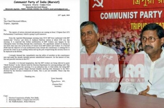 AGARTALA, April 22 (TIWN): Biplab-Pratima’s Criminal Empire continuing Poll rigging preparations for East Tripura LS Election tomorrow. CPI-M leadership complained to Chief Electoral Officer Sriram Taranikanti about illegal movement of BJP goons in East Tripura hired from outside. A group of people with saffron attires landed at Ambasa Railway Station whereas CPI-M has urged the Election Commission to prevent such attempts as their sole aim is to stop voters from casting votes. CPI-M State Genera; Secretary Gautam Das has also alleged that BJP supporters are roaming in bikes with Modi stickers on bikes and they will do same to carry polling agents. CPI-M demanded immediate action of EC on those grounds. Election for the East Tripura constituency will be held on 23rd April (Tuesday) from 7 am to 5 pm. 1645 polling stations are here. EC has notification for all voters to cast their votes on 23rd April without any fear. To ensure confidence building measures, huge numbers of securities have arrived here. Huge numbers of central paramilitary forces have also come from centre and other states. They are deployed across the parts of the East Tripura.