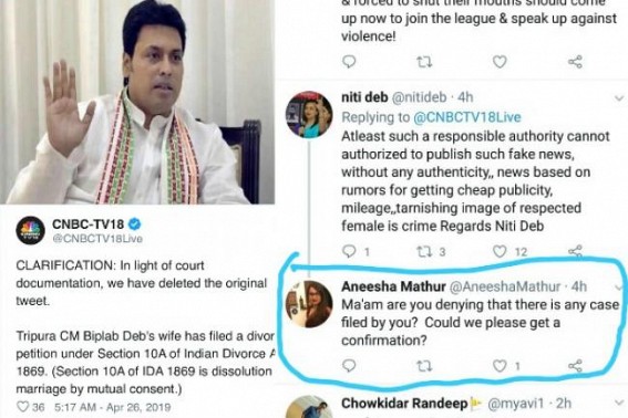 AGARTALA, April 27 (TIWN): The controversial Chief Minister of Tripura Biplab Deb is hitting national media since he became the Chief Minister starting from ‘Internet was existing in Mahabharata’s era’ to ‘Diana Hayden was unworthy to be Miss World’. The Chief Minister came in national media started from News 18 first which claimed there are domestic violence allegation against the CM on his own wife and soon from TIWN to other national media had published the same. Later, when Biplab Deb’s wife denied the issue calling it a rumour responsible media houses verified the paper and then rectified that it was not a domestic violence case against Biplab Deb rather it was just a mutual divorce case followed by an issue. Since yesterday, CM’s wife is giving telephonic interviews to various channel including a chit fund scam accused broker media ‘Deadlines Tripura’ but for a single time the wife of Biplab Deb did not clarify by saying, “I never filed divorce case against my husbandâ€. In her tweet journalists also questioned whether she filed any divorce case against Biplab Deb or not, but she did not reply.