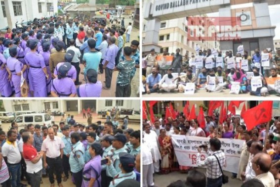 AGARTALA, Sep 12 (TIWN): Tripura’s largest State Govt run GB Hospital turned hotbed for Govt’s inhuman decision of scrapping free medical service. Lack of trust continue between the State Govt and public since the Govt scrapped all free medical services across State hospitals. Except BPL families all the families now to be chargeable for medical care in any Govt hospitals which yet has not been accepted by public and massive tension going on between Govt and the people. At the same time, GB hospital is hitting the news healines everyday. Earlier, it was due to Doctors’ negligence like issues, then patients death due to fee-imposition and today security guards who are under SIS came in massive protest demanding unpaid wages. All theses keeps the GB hospital on the headline everyday.