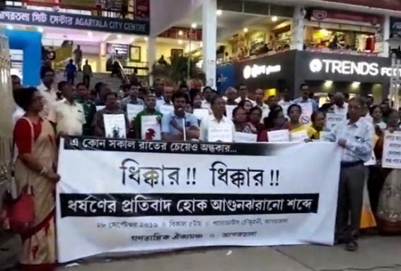 AGARTALA, Sep 28 (TIWN): In a protest over the gang-rape incident at Usha Bazar took place on Sep 24 and Police’s negligence to lodge FIR of the victim, CPI-M while agitating before City Centre on Saturday asked Tripura Police whether they don’t have mothers and sisters at home ?