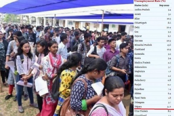 AGARTALA / NEW DELHI, Oct 2 (TIWN): Centre for Monitoring Indian Economy (CMIE) has revealed its monthly data for Indian unemployment rate for September-2019, listing Tripura at the top position in unemployment rate with 31.2%. Indian national unemployment rate is 7.3% and among 29 states, Tripura has bagged the top position this time. Tripura constantly has remained at the top position in unemployment rate, although in August, 2019 it dropped in the second position with 26.4% but this month it jumped at top position with 31.2%.
