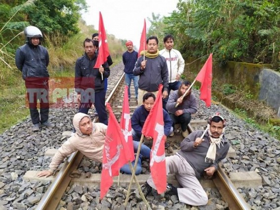 AGARTALA, Jan 8 (TIWN): CPI-M activists blocked railway in ADC and other areas and train services remained paralyzed for long. Due to lack of passengers other transport services were equally hampered. Road and rail blockades were reported from several parts of Tripura on Wednesday as trade union activists along with Leftist supporters picketed in support of the 24-hour general strike against the Centre's "anti-people" policies. The strikers took out rallies in parts of the state and blocked roads and railway tracks in North Tripura mostly. But police removed them to ensure movement of vehicles without hitch.In Tripura, government buses were plying normally but the number of private buses was very less.Heavy police deployment was seen in several areas of the state. Around 25 crore workers are expected to participate in the strike called by trade unions INTUC, AITUC, HMS, CITU, AIUTUC, TUCC, SEWA, AICCTU, LPF, UTUC along with various sectoral independent federations and associations.
