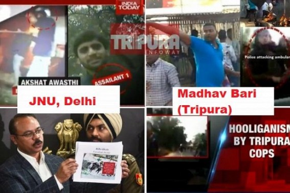 AGARTALA, Jan 11 (TIWN): Delhi police failed to unveil the masked goons inside JNU, rather released stone pelting pictures to make them viral. Amid much autocracy, India Today news channel has exposed how ABVP students were attacking in the JNU campus whereas Delhi Police and the BJP talked in same voice aimed arrest the victims who were injured in ABVP led attacks. Although ABVP members too injured but the way of attacks and the chronology proves that in all BJP ruled states, the party is successfully instigating various violent incidents and the with help of police often put all blames on the other party, either it’s in JNU or in Tripura’s Mdhav Bari on 2019, January 8.