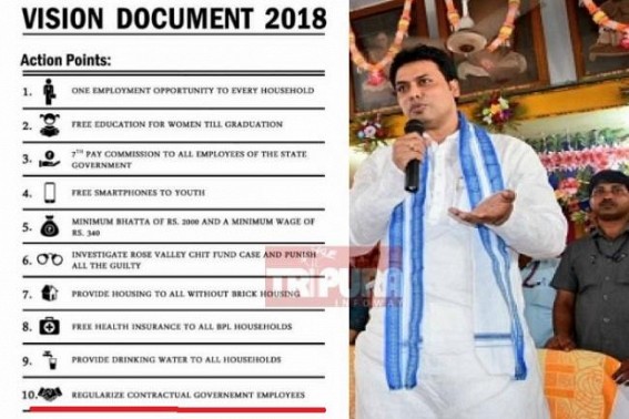 AGARTALA, Feb 19 (TIWN): BJP in its “Vision Documentâ€, first page among its 10 ten promises said that the party if voted to power will regularize all the contractual employees.