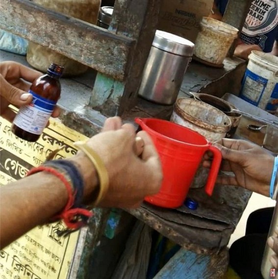 AGARTALA, November 10 (TIWN Exclusive): In heart of Agartala city, local markets has become a hub of contrabands, narcotics business. On an Exclusive investigation mission by TIWN team on Monday, a large amount of contraband items like drug tablets, phensedyl, correx, drug powders have been found selling in a broad day light in tea stalls at Maharajganj Bazar (Gol Bazar).On the issue of narcotics, no amount of laws seems to be enough to reign in the production and distribution of banned substances due to unholy nexus between smugglers and sections of law enforcement, district administration. The smuggling of Phensedyl, with an exceedingly high dose of codeine gained momentum in the present time and this illegal business through Tripura worth multiple crores. But on Monday during an investigation by TIWN team, a section of people found taking Phensedyl, Corex and drugs in a broad day light at Agartala, Maharajganj Bazar tea stall. It has been found that the tea maker was selling the contraband items at his stall, and people taking the dose right on the spot.