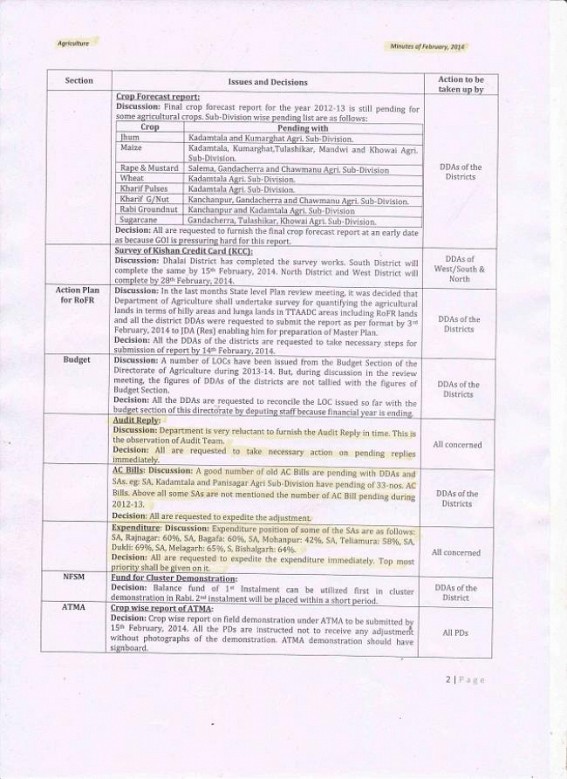 Regarding the AC Bills the meet concluded “ A good number of old AC Bills are pending with DDAs and SAs eg: Kadamtala and Panisagar Agri Sub-Divisions have pending of 33 no.s AC Bills. Above all some SAs are not mentioned the number of AC Bill pending during 2012-2013. In both the cases, the meet requested the concerned officials to do the needful.