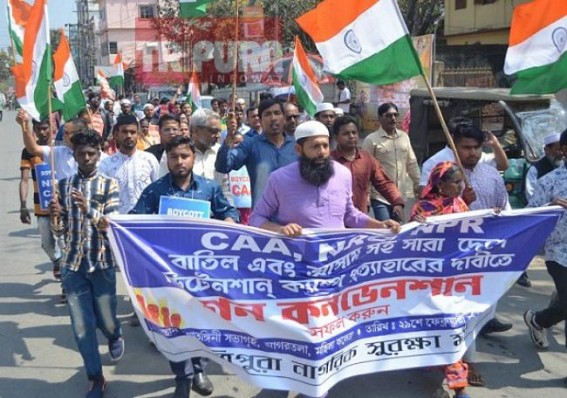 AGARTALA, Feb 29 (TIWN): Along with whole nation, protest in Tripura also continues against unconstitutional NPR, NRC, CAA. On Sunday, Nagarik Mancha staged a massive rally in Agartala with all communities people, eminent persons of the city.Addressing media on behalf of Nagarik Mancha, High Court Senior Advocate Purushottom Roy Barman said, “Due to these unconstitutional moves of the Modi Govt, across India protests are going on. We have organized the protest along with the whole Nation to voice against NRC, NPR, CAA. We urge the people to boycott the NPR immediately. In coming days also protests will be escalated. BJP, RSS’s aim to convert this country into a Hindu Rastra are reflected with these new moves which are violation of the constitutional base and attack on the secularism. In India no law can be made based on religion. They have planned to make Indians refugee.....â€, said Purushottom Roy Barman to media here.“These laws are unconstitutional, uncivilized. No civilized country can have such controversial laws which are dividing the peopleâ€, said Purushottom Roy Barman.