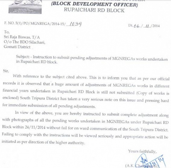 AGARTALA, November 11 (TIWN): After the scam of Rupaichari R.D.Block came under limelight, the higher officials of the department said that as per official records it is observed that a huge amount of adjustments of MGNREGAs works in different financial years undertaken in Rupaichari R.D.Block is still now being submitted (copy of works is enclosed).The South Tripura District has taken a very serious note on this issue and pressing hard for immediate submission of all pending adjustments, the source added.The official instructed to submit complete adjustment along with photographs of all the pending works undertaken in MGNREGAs under Rupaichari R.D.Block within 24/11/2014.