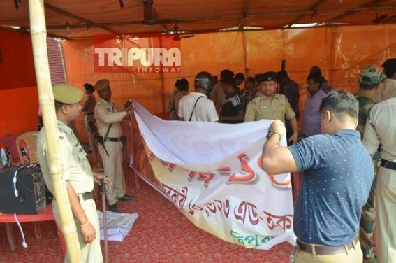 AGARTALA, March 17 (TIWN): 10323 Teachers have tasted BJP as a life-time political doze and what is called a ‘fraud’ party to loot vote banks with fake promises. The 10323 teachers who were promised to have a great future by top political leaders at the national level and also Tripura Chief Minister Biplab Deb who promised the same before election today has sent huge numbers of police and arm forces to remove the teachers and dragged them from the spot. This incident took place when their leader Bimal Saha was absent and went for natural work. Police arrested the teachers, spoiled their computer, sound boxes and other items. After seeing the situation and empty protest spot gheraoed by police, Bimal Saha has condemned the incident. Police were trying to remove the teachers from yesterday night as DM imposed section-144 claiming Corona-virus threat. The 10323 teachers were demonstrating in Orient Chowmuhani demanding.