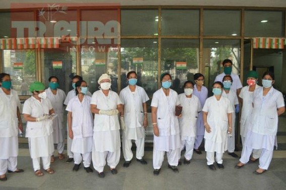 AGARTALA / NEW DELHI, April 8 (TIWN): With one Corona-Virus positive patient was found in Tripura after she was admitted in GB hospital's isolation ward taking around 50 persons in quarantine along with Doctors, medical staffs in GB hospital (where the patient is now kept) came in massive protest demanding Personal Protective Equipment (PPE) for them. In an agitation, the sisters and other medical staffs said, “There was no plan for protest today, but when we have seen the media persons, we have rushed here to address the Govt and the people about the insecurity we are undergoing. Our demand is PPE which is the utmost important equipment now. Also, there is proper toilet and proper arrangements are no existing. We are undergoing lots of problems. Sanitizers and masks nothing have been given to us properly. The masks according to rules can not be wore beyond 3 hours but here we are using it for days after days. When no proper equipment is there, the corona patient has been kept in the middle of the hospital area".