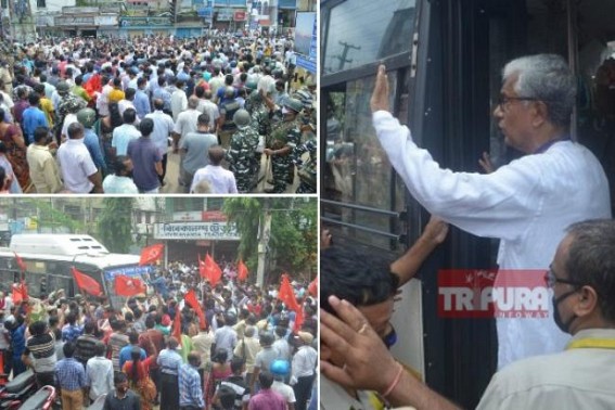 However, former CM Manik Sarkar was detained under police’s request and Manik Sarkar today asked comrades to cooperate with police as police are not anyone’s enemy. But, the CPI-M agitators stopped the bus and brought back Manik Sarkar from bus and the bus remained immovable due to protest.