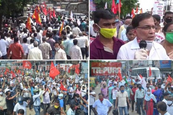AGARTALA, Sep 25 (TIWN): Under Kishan Sangharsha Samannoy Samiti led by various Left Parties and Farmers' unit a massive rally has been organized in Agartala. Thousands of agitators have joined the protest, raising voice against the Farm-Bill passed under the Modi Govt in the Parliament. Thousands of people have protested against the Anti-Farmer bill. Talking to media, Senior CPI-M leader, former State Finance Minister Badal Choudhury said, "BJP Govt has passed the bill in Parliament in totally illegal manner, by butchering the democracy. BJP Govt's ideology is to handover the Agriculture and other sectors to the corporates and this bill is one of such an examples paving the way to convert the farmers into Slaves in the hands of the Corporates. This Bill is enough to convert farmers into slaves as all corporate sectors will be controlling the agriculture. There will be no minimum price to the farmers and FCI's role is doubtable. Farmers are already in problems due to debts and now what will happen to the farmers due to the Anti-Farm bill ?"