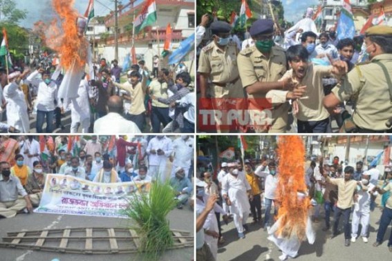 AGARTALA, Sep 28 (TIWN): Anti-Farmers Bill protests have rocked Tripura's various parts led by the Congress party. The party has said that it will continue protests in coming days until the Govt is scrapping the anti-farmers bill. However, amid nationwide protests, President Ram Nath Kovind on Sunday gave his assent to all the three contentious farm bills, which opposition parties say are anti-farmer and corporate-friendly, after they were recently passed by Parliament during its monsoon session amid vehement protests. Agitating Congress activists in Agartala were seen burning effigy of Narendra Modi, staged protest with crops in hands. It was a part of Raj Bhawan Abhiyan. The Congress protesters also sat in sit and demonstration programme amid the protest. Talking to media, Congress senior leader Birjit Sinha said, 'Through protests, this farmers bills must be scrapped. Today, Narendra Modi Govt has announced war against the farmers. Congress will continue protests unless Govt scraps the bills".