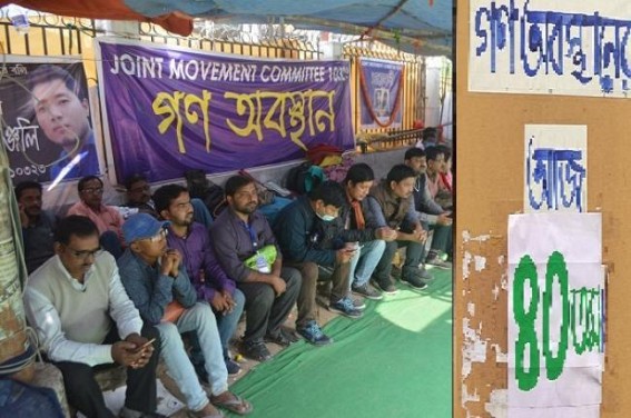 AGARTALA, Jan 15 (TIWN): The 10323 teachers' protest has fallen on Day 40 with no response coming from the State Govt yet. The Education Dept which said to give a written letter to the 10323 teachers JMC before 16th January, however, has not replied to them. Addressing from the agitation spot, JMC member Mintu Debbarma raised various legal queries which JMC raised earlier many times already. He asked, why the Govt is silent on those points ? Why it is not breaking its silence over 10323 teachers questions. Tomorrow however, the JMC is scheduled to meet the Education Secretary whom they met on January 13 and submitted a memorandum with such legal queries as - 1) Where are the 10323 teachers' names in petition and in verdict ? 2) Why no termination letter was given etc. The teachers who started protest from December 7 are still continuing their agitation without a failure. The joint movement committee of the 10323 teachers are organizing this movement and without any break, the protest continues before Agartala City Centre.