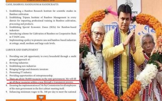 BJP in its Vision Document gave various promises like house to house employment to 50,000 Govt jobs in 1-Year, solving 10323 teachers problems, 7th pay commission, Free SMART Phones for all Youths of Tripura, Regularizing the Contractual employees but so far almost all portions of the Vision Document left "untouched" and moreover, the reality was just the opposite of the promise give to the votes. Tripura has become Second Topper in Unemployment Rate after Jammu & Kashmir in January, In January, 2021, Tripura was recorded as the second topper in unemployment rates in Indian states.