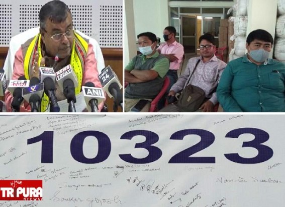 AGARTALA, Feb 22 (TIWN): "Justice for 10323" organization's members on Monday have asked Education Minister Ratanlal Nath why is he not clarifying how many teachers were terminated by Courts ? This question was raised by the 10323 teachers after Ratanlal Nath allegedly said that not all the 10323 teachers are affected in Court order. Addressing media on behalf of Justice for 10323 Teachers (one of the Organizations which formed Joint-Movement-Committee) Ajay Debbarma said, "Recently Education Minister Ratanlal Nath said in a press meet that 10323 teachers' numbers are not mentioned in the verdict. So we want to know what the exact terminated teachers numbers".