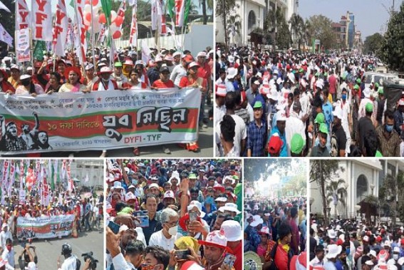 AGARTALA, Feb 27 (TIWN): The Left wings massive protest rally has flooded Agartala City today as thousands of DYFI, TYF activists had joined the rally. With 10 issues, the protest was called and Left's gathering was massive, vast. This is not the first time that the Left in Tripura organized such rallies. Ahead of ADC Poll, massive indigenous supports were too observed in today's rally. Slogans were raised against BJP Govt and its Governance style, deprivation etc. The programme was led by former CM cum opposition leader Manik Sarkar, GMP President cum ex-MP Jitendra Choudhury, Pabitra Kar and other top leaders. Former Chief Minister Manik Sarkar on Saturday has taken dig at Missed Call Jobs, 50000 Govt Job promises of the BJP leaders before 2018 Assembly Election.