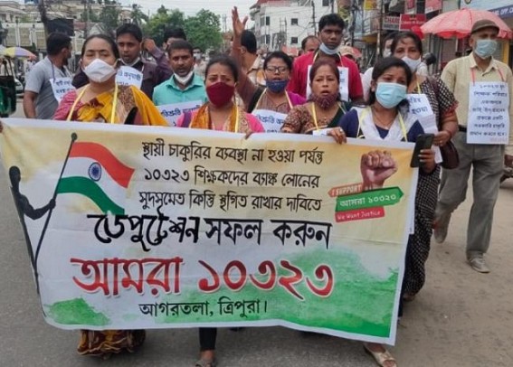 AGARTALA, Aug 23 (TIWN): "Amra 10323", one of the 10323 teachers' organizations today held a protest in Agartala voicing against the injustice with the terminated teachers amid death tolls of the terminated teachers have increased to 106. The protest was staged amid Banks are pressuring the teachers to clear their loans which they had taken during their jobs. In protest, Amra 10323 teachers organization said, when the terminated teachers are unable to arrange two meals for their families, how can they clear the loans ? The teachers are not only being pressured to clear loans but the guarantors are losing their money as Banks started slashing amounts from their accounts. Moreover, the properties of the terminated teachers are at risk as Banks plan to seize them. Amra 10323 organization leader Dalia Das said, "The Government which promised us to resolve our matter, must fulfill its promise now. We lost our jobs".