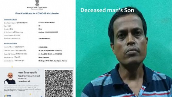AGARTALA, Aug 25 (TIWN): In another peculiar incident, a son has received his father's Covid vaccine second dose certificate although his father is already dead. The incident took place at Kamalasagar constituency's Patharidwar area. Late Chandramohan Sarkar was suffering from a heavy fever and died on May 21st. On 19th April, he received his first Covid vaccine and then after a few days, he died of fever. But from a ghostly vaccination drive, his son received a "successful vaccination" message in his mobile in the name of his father. When he searched for certificates, he also received Covid vaccination certificate in his father's name. Being surprised, he called the media and talked in detail. The deceased's son expressed heavy resentment over the incident. He also has sought proper investigation in the matter.