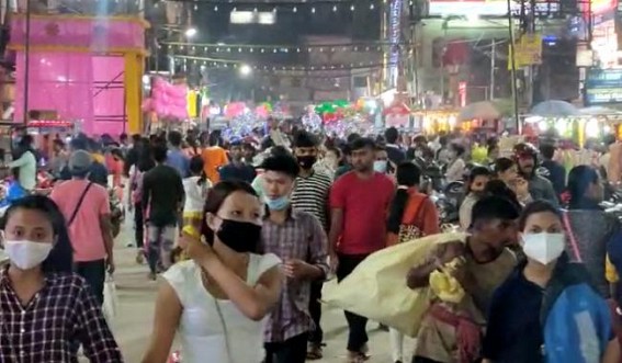 AGARTALA, Oct 9 (TIWN): Agartala city is flooded by crowds ahead of Durga puja, people are busy in shopping, businessmen are busy in selling their items at maximum possible prices and youngsters are enjoying outings with friends. Though Covid concern remains on peak, the crowd is turning unmanageable as Durga puja is the biggest annual festival of Tripura, Bengal and Assam like states. Despite price rise, huge numbers of people are thronging the branded outlets' showrooms to grab the best outfits for themselves and their loved ones. Puja pandals will be inaugurated from tomorrow. Designer salwar-suits, kurtis and leggings are the favourites for girls and women of all ages. While ethnic attires beckon the young girls, most of the young boys opt for western outfits like slim T-shirts and narrow fit jeans.
