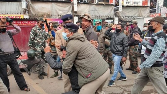 Talking to the media, a Police Officer at Agartala City Centre first claimed "10323 Teachers’ Protest was Illegal because they had no Permission", but when Journalists reminded him about Constitutional Rights of the agitators, he said, "They were arrested due to Covid Restrictions". But 10323 teachers said, they were protesting with Social Distancing and it was Police who broke the protocols but jumped to arrest them. Police were also spotted assaulting the 10323 teachers whereas an elderly aged woman was pushed to the bus by lady police.