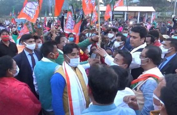 AGARTALA, Jan 28 (TIWN): Supreme Court’s term “Election Virus” was reflected in Tripura today, when CM Biplab Deb violated all Covid rules and guidelines. It was Tripura Govt that had prohibited all political, religious, and other gatherings due to Corona Virus, and yesterday, 10323 teachers were arrested and tortured brutally by police in the name of Corona virus. But today CM Biplab Deb joined a mass gathering and he was not wearing any mask during the entire programme. There was no social distancing and the entire programme was illegal as per Covid restrictions. However, as it is a BJP party’s programme, as expected, the police instead of taking action gave security to the programme.