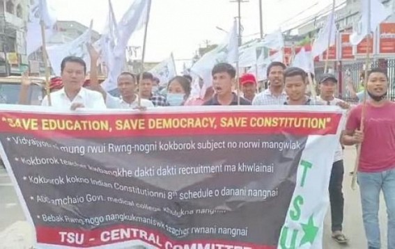 AGARTALA, Aug 28 (TIWN): CPI-M’s students wing Tripura Students Union (TSU) on Sunday held a protest alleging Education Dept is trying to abolish the Kokborok language’s learning in schools under Vidyajyoti Project.