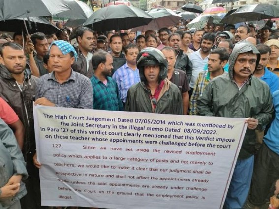 AGARTALA, Sep 14 (TIWN): Terminated 10323 teachers on Wednesday have alleged that High Court and Supreme Court’s verdicts on 10323 teachers’ case were wrongly implemented which needs to be corrected. Today, the 10323 teachers gheraoed Education Dept seeking replies on the Supreme Court RTI issue and sought permission to join in schools. Addressing media, 10323 JMC member Kamal Deb said, “Today, we are here demanding permission to join in schools and without getting the permission, we will not move from here. Let the Home Dept and its police do whatever they like but we will fight till the end for our rights”. Huge numbers of police, TSR were deployed, and barricades were imposed to stop the 10323 teachers in front of the Shiksha Bhawan, Office Lane.