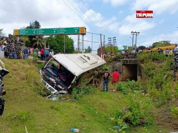 AGARTALA, March 21 (TIWN): Many injured in a road accident on Sabroom-Agartala route after a bus lost control and fell into a ditch. Out of the injured persons, four are critical and one is very serious. After getting information about the incident, Fire Brigade team rushed to the spot and rescued the injured persons to hospital. The incident took place in Damdama area of Sabroom on Tuesday generated panic in the locality.