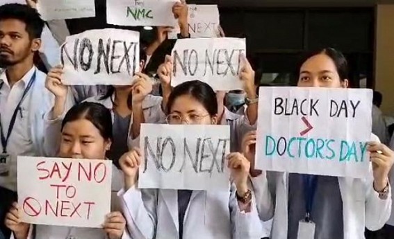 AGARTALA, July 1 (TIWN): Protesting against the sudden imposition of National Exit Test for MBBS (NEXT-1) on students, the students of Agartala Govt Medical College (AGMC) staged a protest on Saturday with meaningful banners saying “No” to such tests. The students have observed this Doctors’ Day as a “Black Day” for imposing such computer-based exams upon them just giving them 6 months time due to which the final year students are undergoing huge pressure. When the students were preparing for the final exams, such unexpected declarations elevated the question of whether the Education system is using students as guinea pigs or not. The agitating students said, they will meet the Chief Minister of the state who himself is a Doctor.