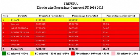 The South district has achieved a moderate number of 47.63 mandays with a total generation of 39, 70,000 mandays. Lastly, an average mandays of 48.03 to each household basis in the Unokoti district has been observed. In this regard it should be noted that only two months are left in the current fiscal of 2014-15.