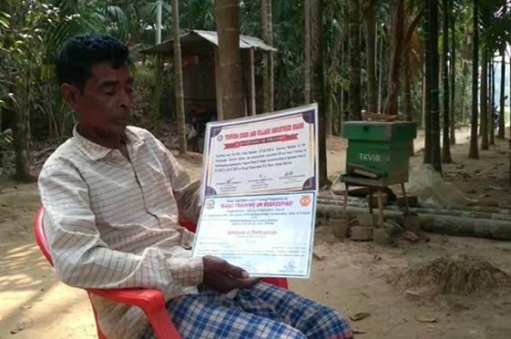 KAMALPUR, Feb 23 (TIWN): Bee farming appears as a challenging field to adapt for permanent livelihood but there is a proverb – When there is will, there is a way and Subal Malakar has proven it correct, by successfully battling against heavy poverty that he had witnessed since his childhood. The bee farmer in Durga Chowmuhani block who has been surviving with his family with single earning from bee-nurturing has requested Tripura’s unemployed youth to choose this profession where they can earn from home.