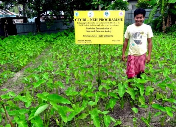 Agartala, February 25 (TIWN): In order to offer sustainable livelihood of tribal farmers through popularizing high yield non acrid variety of some minor tuber crop like Elephant Foot Yam var, Krishi Vigyan Kendra of Divyodoya has been implementing a plan “Enhancing food security and sustainable livelihoods in the North-Eastern India through tuber crops technologies†at Boltali village under Khowai sub-division since 2013.