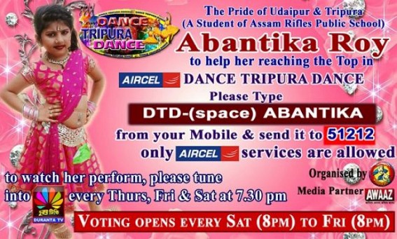 UDAIPUR, March 10 (TIWN): The entire Gomati District , especially those living dance and culture , are gearing up with a little girl of merely 7 years old namely Abantika Roy, a student of Class-II reading in Assam Rifles Public School of Udaipur. Abantika is the sole contender from the Gomati District in the Dance Tripura Dance talent hunt contest organized by Air cell .