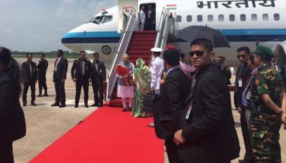 AGARTALA / DHAKA, June 6 (TIWN): Indian Prime Minister Narendra Modi arrived here on Saturday on a two-day "historic" visit to Bangladesh. Modi, who arrived at Dhaka's Hazrat Shahjalal International Airport in a special Indian Air Force (IAF) aircraft, Rajdoot, was received, in a break from protocol, by his Bangladeshi counterpart, Sheikh Hasina. He was accorded a ceremonial welcome, after which he inspectd a guard of honour.Modi is scheduled to hold talks with Sheikh Hasina and ink several agreements, especially in the field of connectivity and trade.West Bengal Chief Minister Mamata Banerjee, who is a part of the Indian prime minister's delegation, had reached Dhaka on Friday.With the land swap agreement as the centerpiece, Prime Minister Narendra Modi left on Saturday on a two-day "historic" visit to Bangladesh where he will hold talks with his Bangladeshi counterpart Sheikh Hasina and ink several agreements, especially in the field of connectivity and trade.Prime Minister Sheikh Hasina received her Indian counterpart at the VVIP tarmac of Hazrat Shahjalal International Airport around 10:15am.This visit, first to Bangladesh by Prime Minister Narendra Modi, reflects the importance attached by India to the bilateral relationship. Mamata Banerjee is the only Chief Minister of an Indian state West Bengal will be accompanying the Prime Minister during his visit to Bangladesh. Mamata Banerjee, Chief minister of West Bengal, arrived in Dhaka on an Air Indian flight along with her six entourages on Friday night.