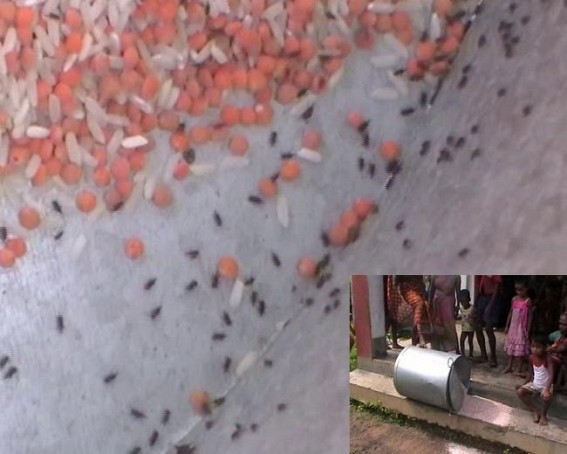 KHOWAI, June 22 (TIWN): Corruption tainted CPI-M Govt’s misdeeds, massive corruptions destroying the basic dignity of human life in Tripura as Govt supplying insect filled poisonous mid-day meals for children consumption in the schools across the State. Central Govt sponsored mid-day-meal scheme main purpose was enhancing enrolment of children in schools, improving the nutritional status, health of children. But for Tripura this mid-day-meal has become almost a life risk matter and thus a threat to all malnourished children’s life. Chief Minister Manik Sarkar and his dysfunctional Education Minister Tapan Chakraborty indeed very lucky that none of these Govt corruptions, irregularities, scams, tortures on State’s children, people will ever appear in national media as most of the national media journalists are purchased successfully by ruling CPI-M. So as a result, most of these pet correspondents based in Agartala prefer to close eyes on daily sufferings of people and compete for hiding all type of Govt Corruption. Needless to say that, 100% credit for building Manik Sarkar’s clean image nationwide certainly belong to some national media correspondents based in Agartala. In return CM gifted them land, residences, money, jobs for spouses etc. Due to utter disregard of human life and corrupt administration, Khowai U.D. Nagar Anganwadi center engaged storing insect filled rice, cereals (musur dal), pesticide laden foods for consumption of little children in Mid-Day meal scheme. It is to be mentioned that on 26th August’ 2014 at Bishalghar’s Noyapara S.B School 48 students fell ill after taking the midday meal. Around 3 lakh 30 thousand 780 students are benefited under the midday meal scheme.