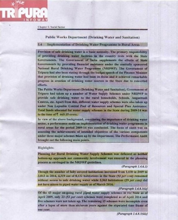 KAMALPUR, Nov 3 (TIWN): Often the State government trumpeted the demand that in spite of acute ‘central deprivation’ in different development works, the State attained an exemplary mark of development. Among other departments, it has been claimed that the Drinking Water and Sanitation (DWS) department have become able to cover the maximum numbers of habitations in the State with safe drinking water. But the reality of such demands and claims was revealed in the CAG Report 1 of 2015 of Govt. of Tripura. CAG revealed this report for the five years from 2009 to 2014.