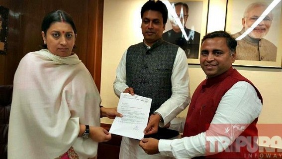 UDAIPUR, Jan 16 (TIWN): State BJP President Biplab Deb and BJP's state observer Sunil Deodhar met Union HRD Minister Smriti Jubin Irani and submitted a memorandum demanding to set up a Kendriya Vidyalay at Udaipur, Gomati District. The two leaders met the Union Minister at her office in Delhi and appealed her to take initiative so that the school can start functioning from the next academic year starting from April.